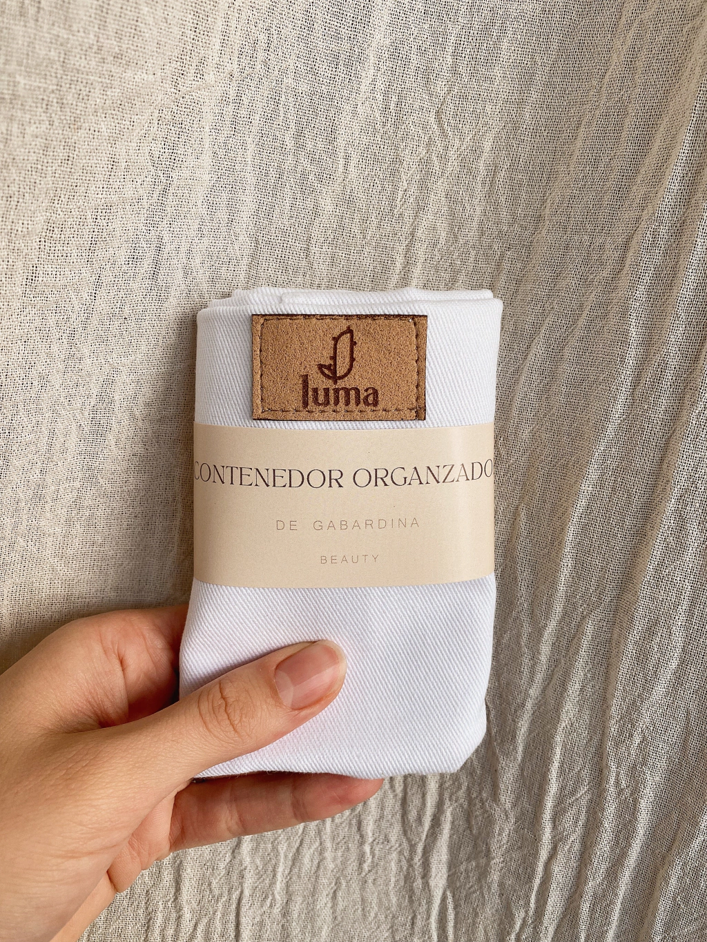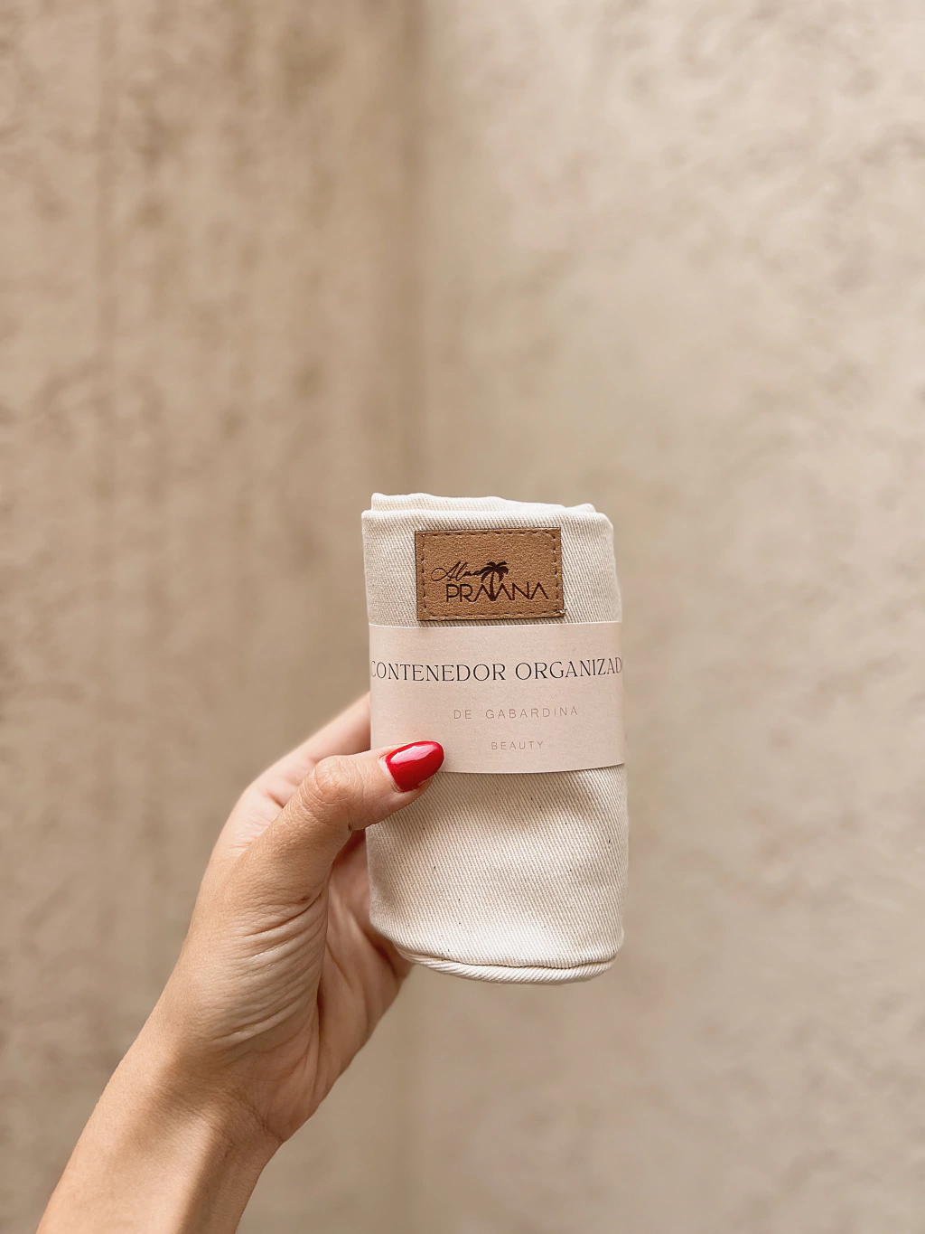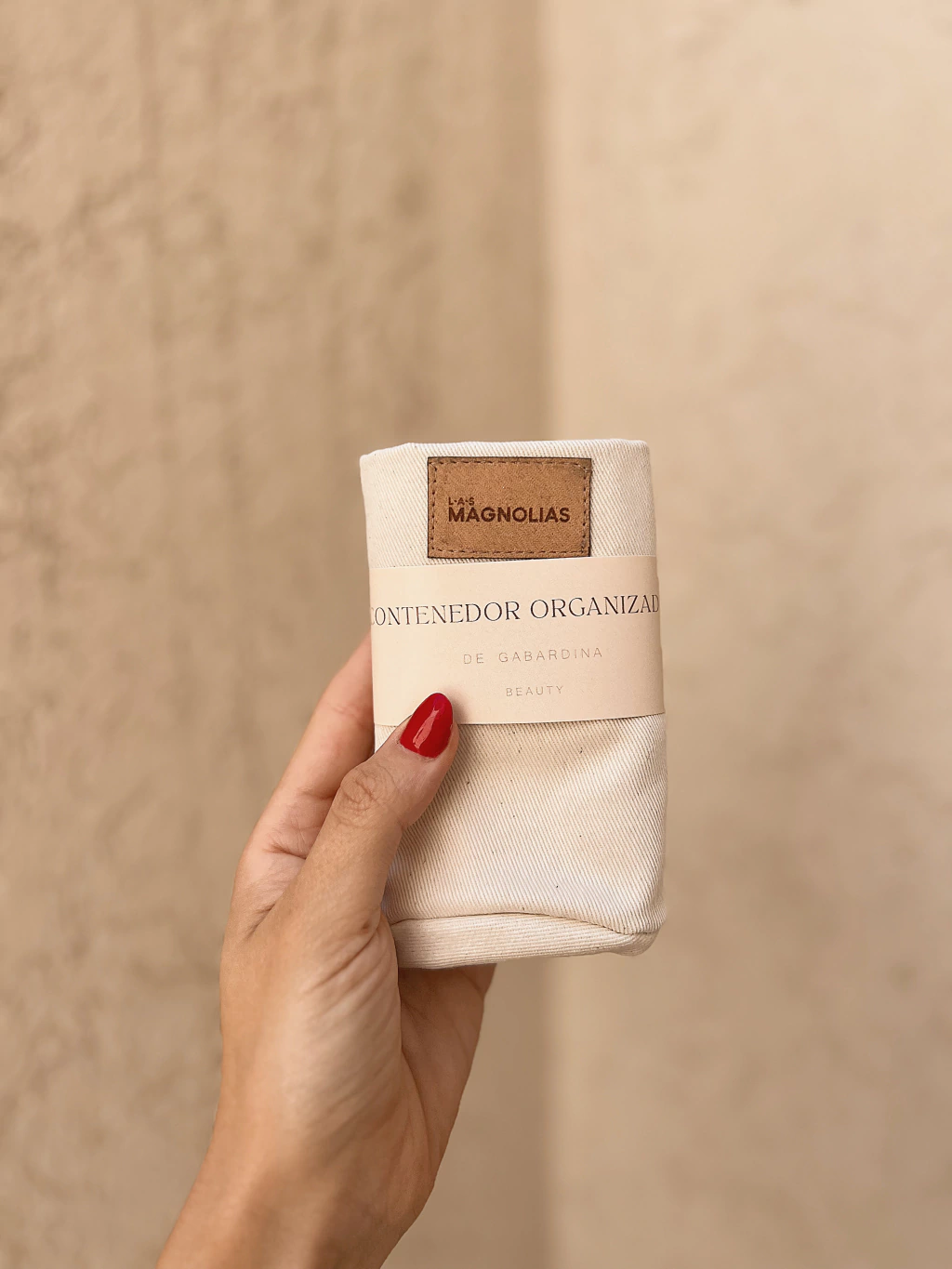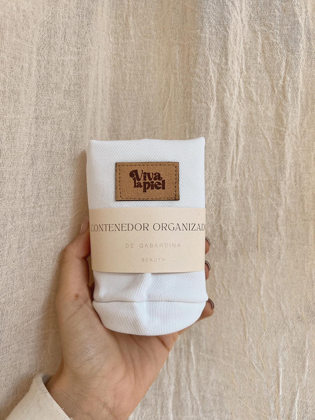 De gabardina firme para guardar y organizar todos tus productos, facil de lavar y de llevar a donde quieras porque podes doblarlo.